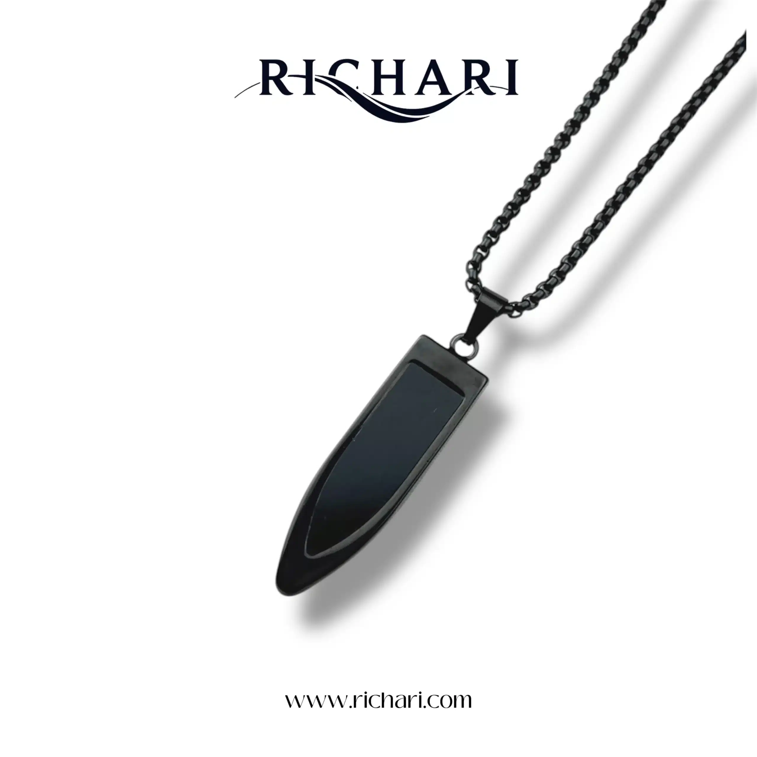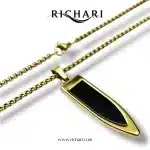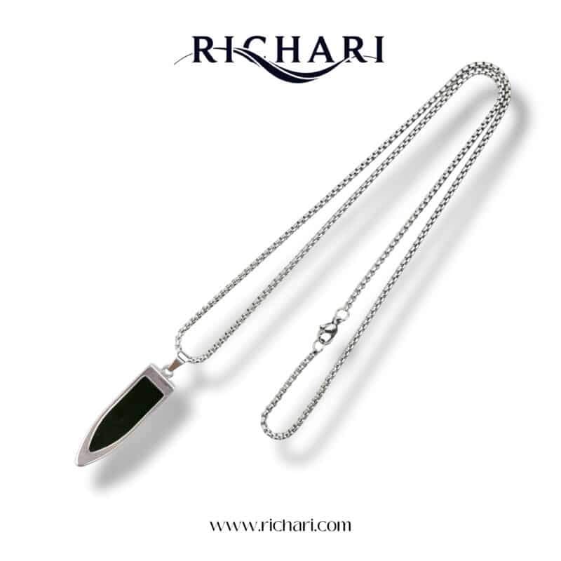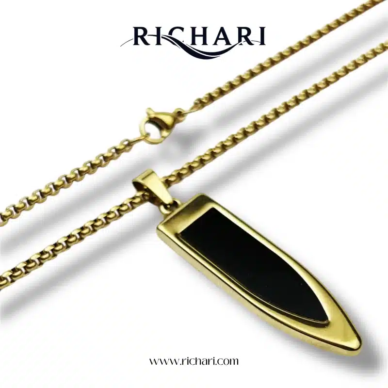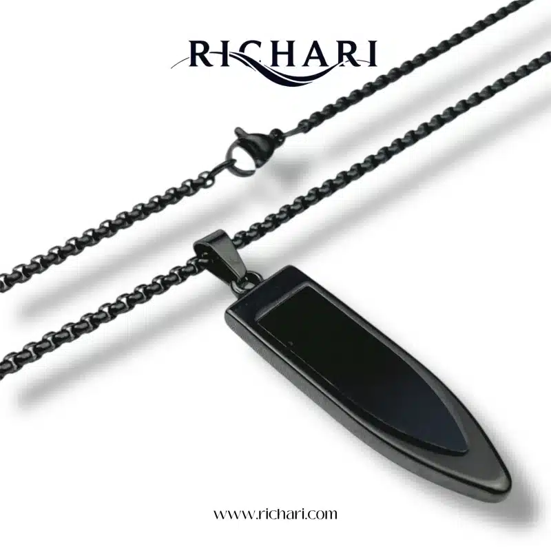 Elevate your everyday style with the Obsidian Blade Pendant Necklace by Richari. Crafted with precision and sophistication, this striking piece features a uniquely shaped pendant reminiscent of a blade, symbolizing strength and clarity. The pendant showcases a polished black inlay, inspired by obsidian, adding depth and mystery to the design.