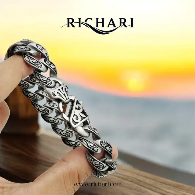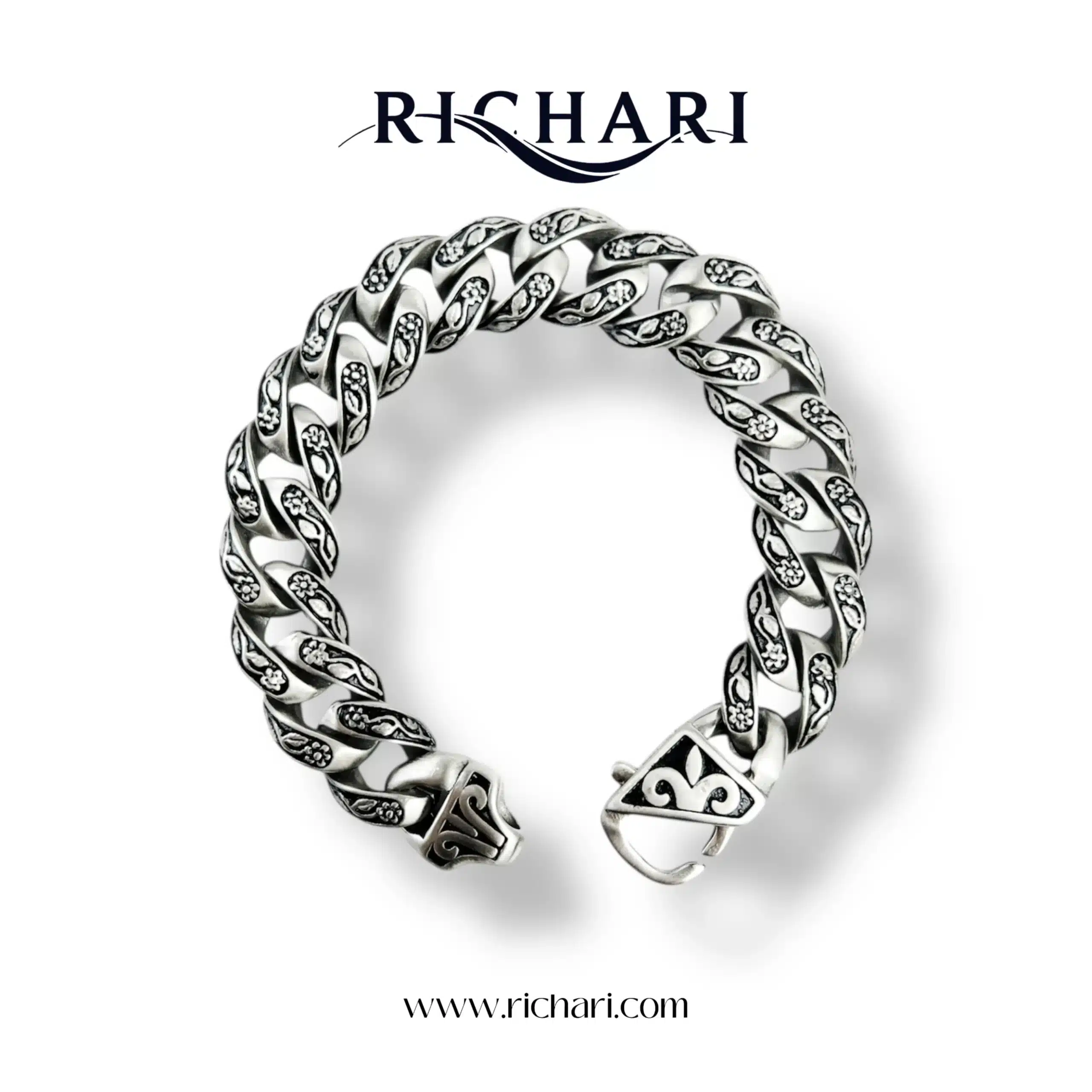 Step into refined masculinity with the Richari Ornate Silver Cuban Link Bracelet — a striking accessory for men who value craftsmanship and individuality. This piece features robust Cuban-style links meticulously engraved with intricate patterns, offering a sophisticated twist on a classic form. The bracelet’s antique finish highlights its handcrafted artistry, while the secure decorative clasp ensures both style and function. Ideal for statement wear, this bracelet adds a bold edge to both casual and formal outfits.