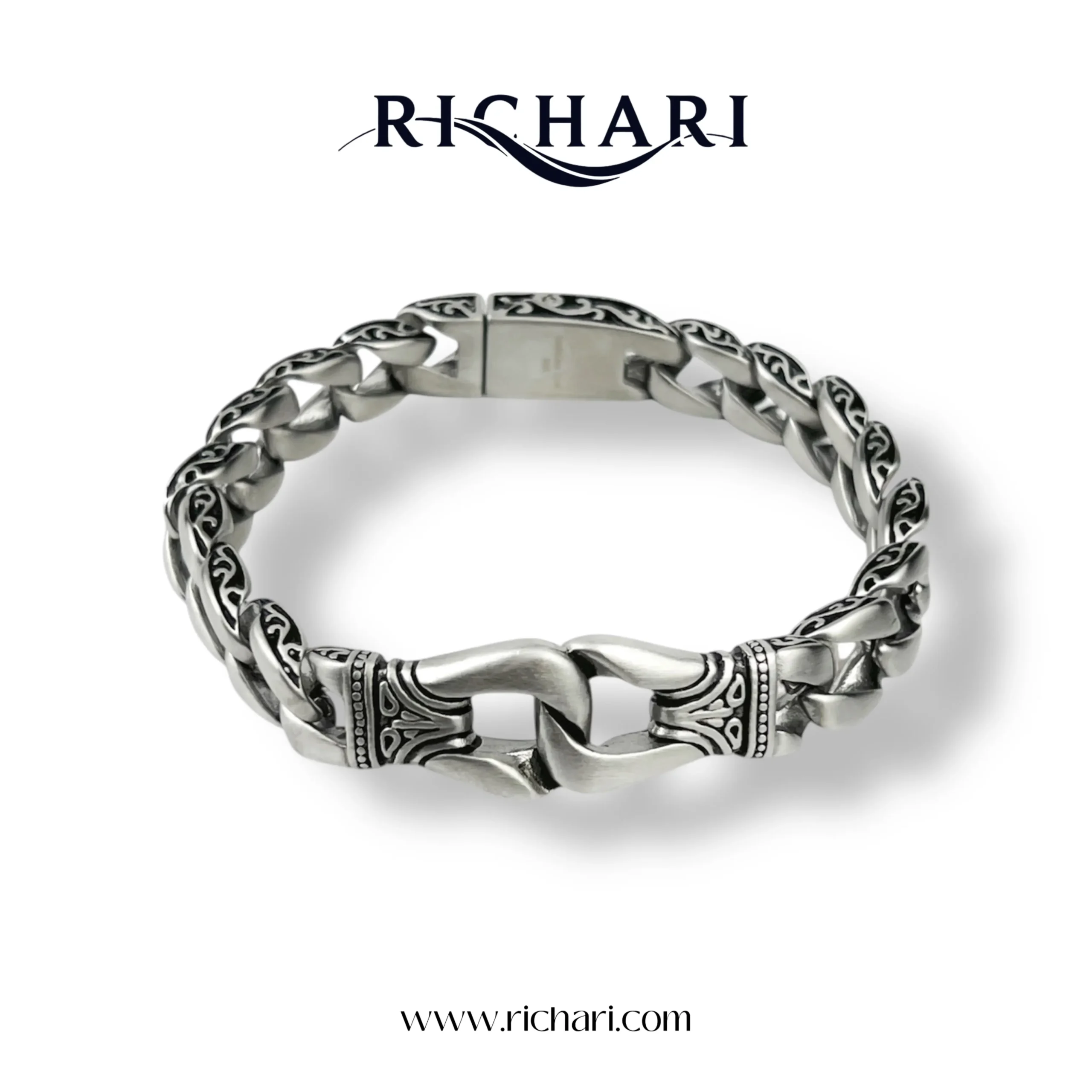 Introducing the Richari Signature Engraved Link Bracelet — a bold yet sophisticated piece that fuses traditional craftsmanship with a contemporary edge. Designed with a unique combination of broad links and precision-engraved detailing, this bracelet is crafted from solid 925 sterling silver for enduring quality. The front features extra-wide center links with baroque-style embellishments that command attention without overpowering your style. A sleek box clasp ensures a secure and comfortable fit, making this bracelet a versatile staple for any refined wardrobe.
