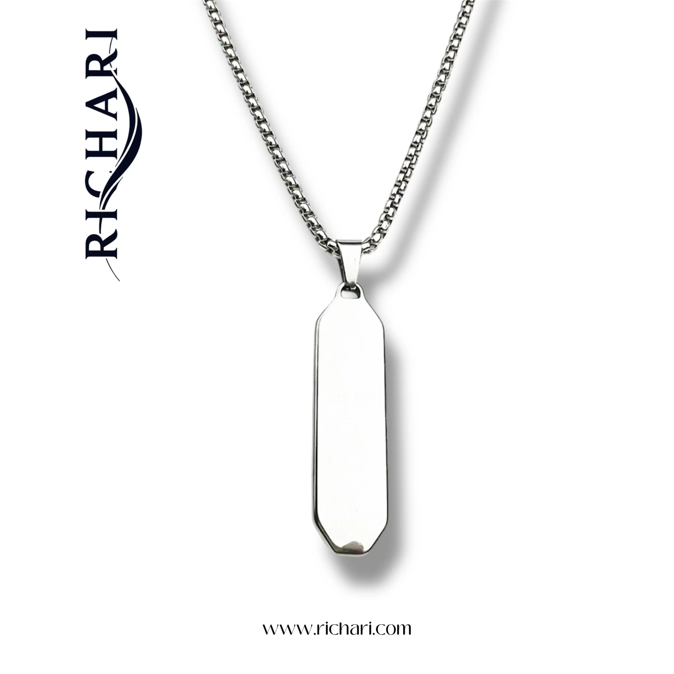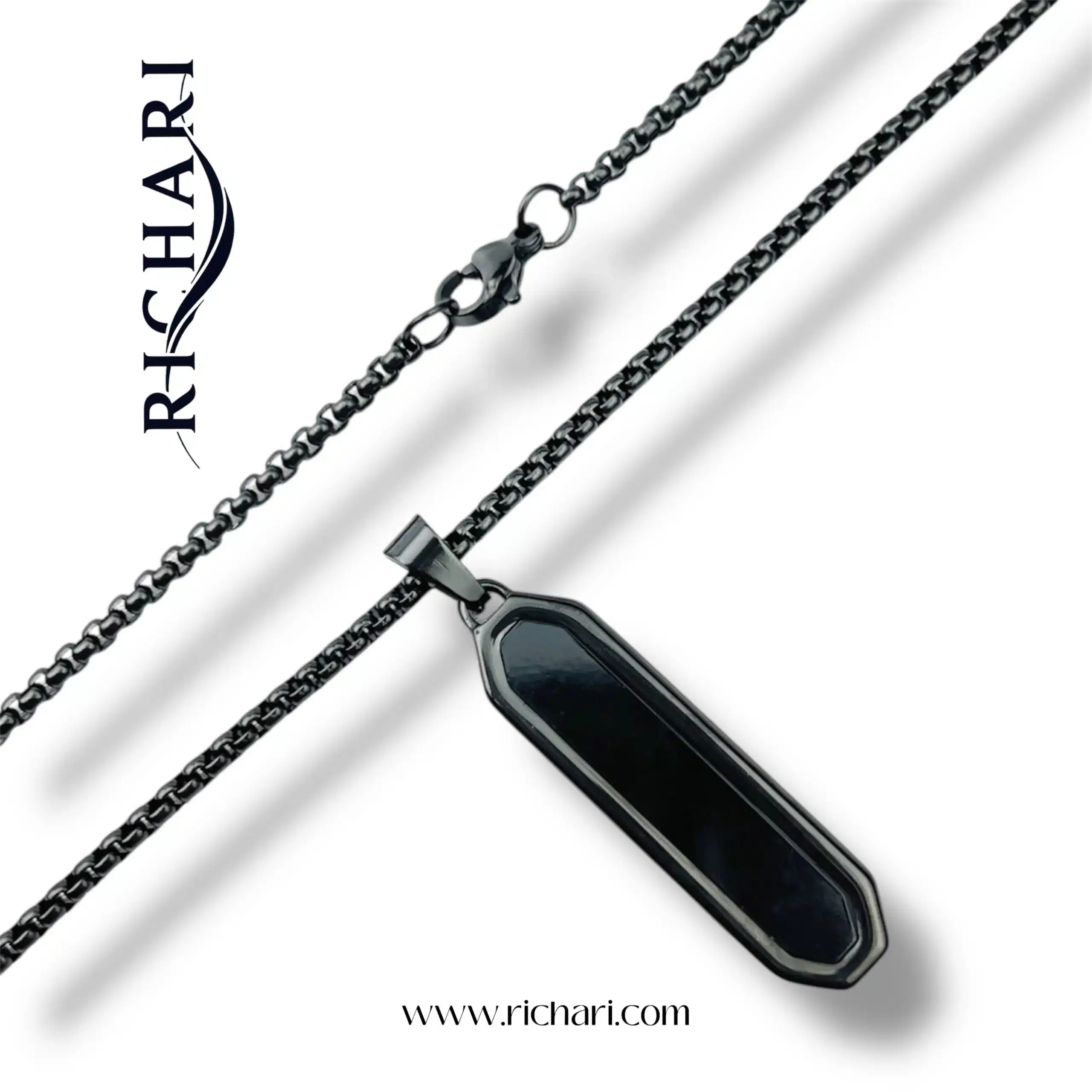 Introducing The Sentinel Bar Necklace—a bold, architectural statement piece designed for the man who values precision and clean geometry. Unlike standard rectangular pendants, this piece features chamfered (angled) edges, giving it a unique hexagonal profile that catches the light. The centerpiece is a deep black inlay, contrasted by the polished stainless steel frame. It’s a sophisticated, attention-grabbing accessory that elevates any outfit, from a simple tee to a sharp blazer.